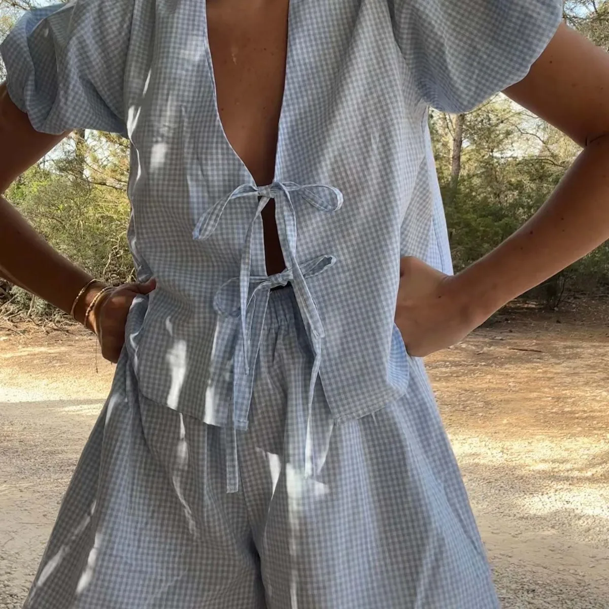Y2K Vintage Plaid 2pcs Sets Loose V Neck Puff Sleeve Front Tie-Up Blouse Top + Shorts Lounge Matching Set Women's 2 Piece Outfit